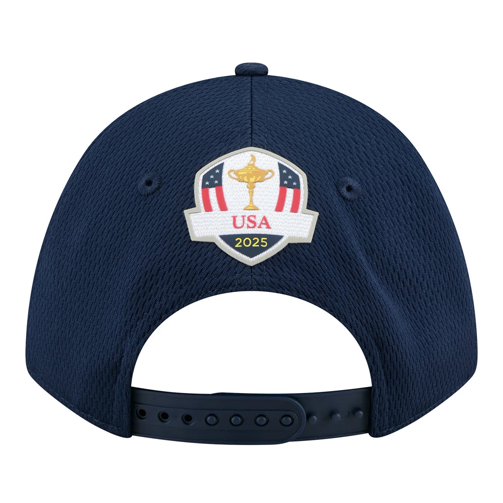 The 2025 Ryder Cup Team USA 9FORTY M-Crown Ladies Fit Snapback features an embroidered Team USA logo on the front panels with a silicone Ryder Cup logo above an adjustable snapback closure at the rear. Additional details include Ryder Cup pin flag on the front left panel and a gray undervisor.